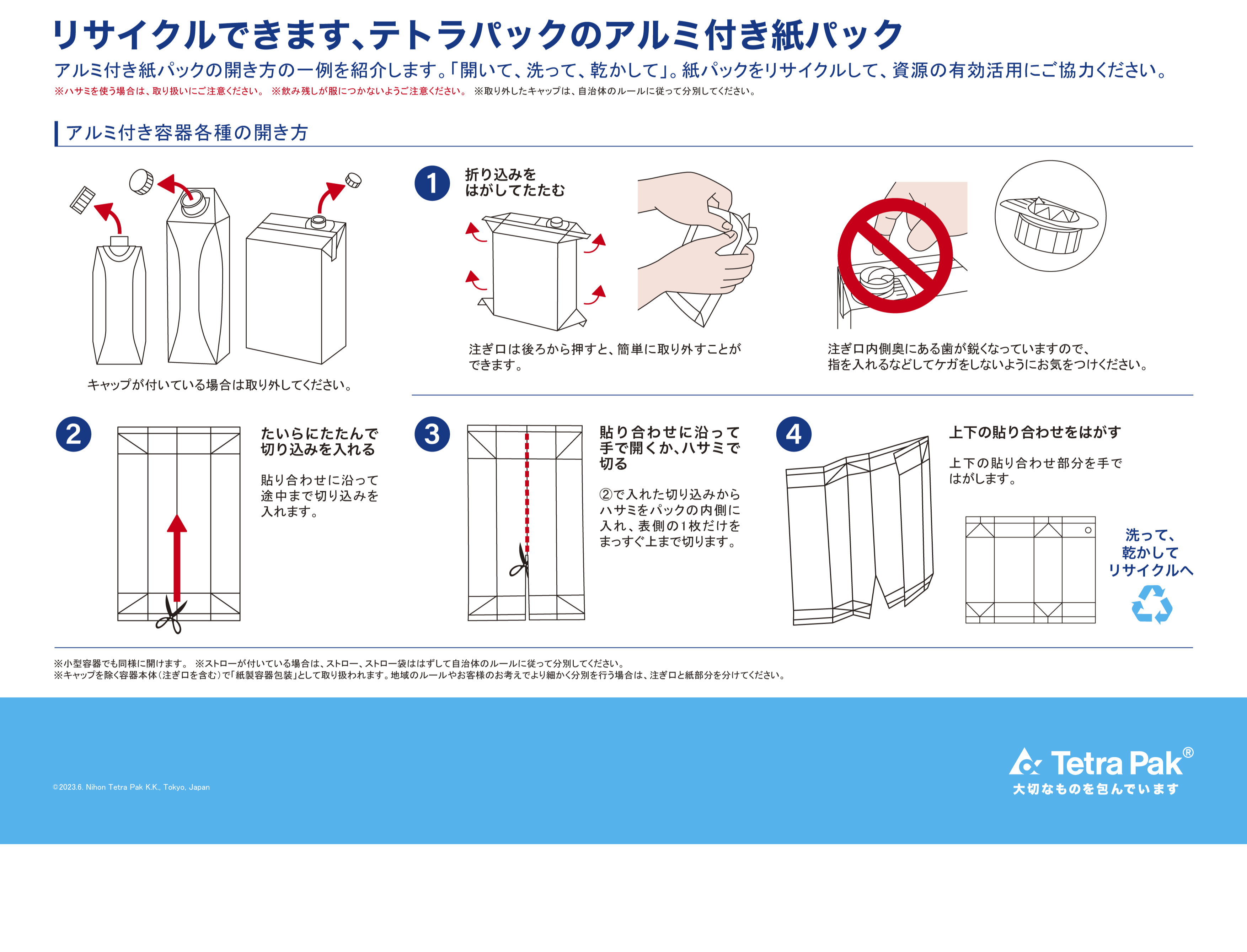 【回収対象】 裏が銀色のアルミ付きの紙パック(野菜ジュース、豆乳、酒などの紙容器) ・ キャップやストローは取り除いてください。 ・ メーカー、購入場所は問いません。